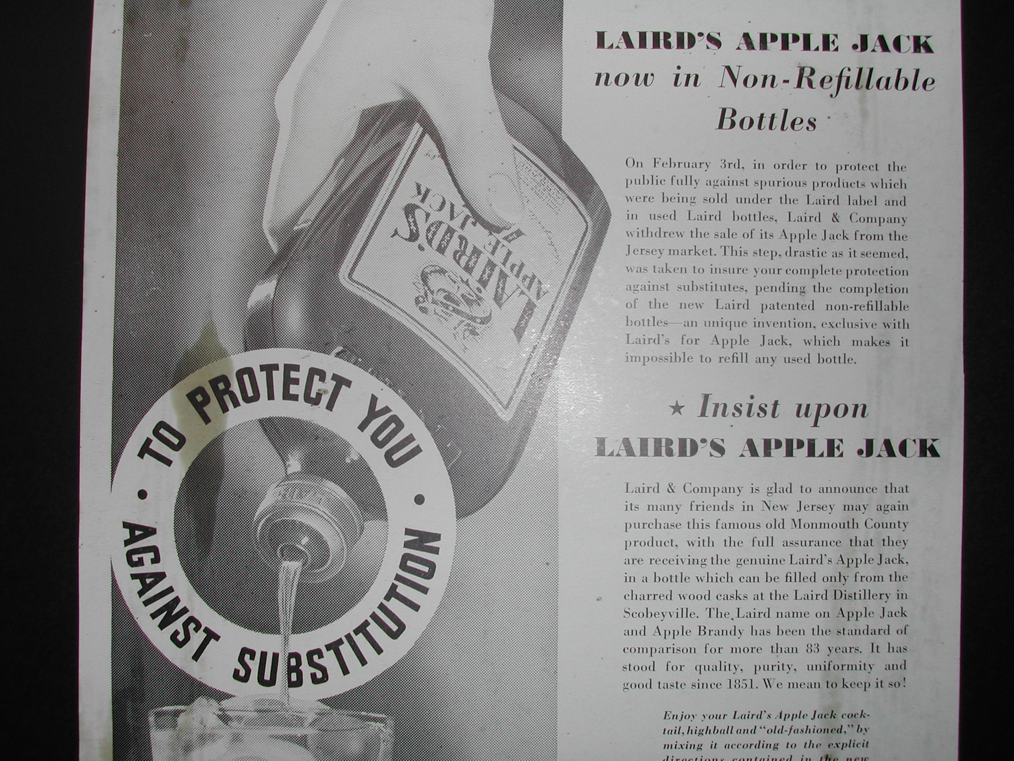 After the alcohol ban was lifted, all these little bootleggers here in New Jersey decided to go into the legal business of selling applejack. Actually, my grandfather and my uncle had a campaign to save the integrity of it where they started purchasing a lot of these small distributors that made an inferior product. There were cases where people would take our empty bottles and refill them with another apple brandy and try to resell it as Laird’s. My grandfather actually had a patented non-refillable bottle developed, and that’s how we ensured the product was ours. It had a special metal cap on it that, once it was taken off, couldn’t be put back on.